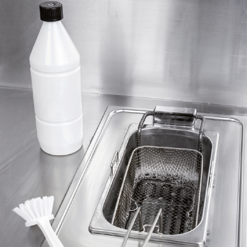 Friteuza trebuie curatata cu produse special dedicate acestora inainte de a fi reumplute cu ulei.