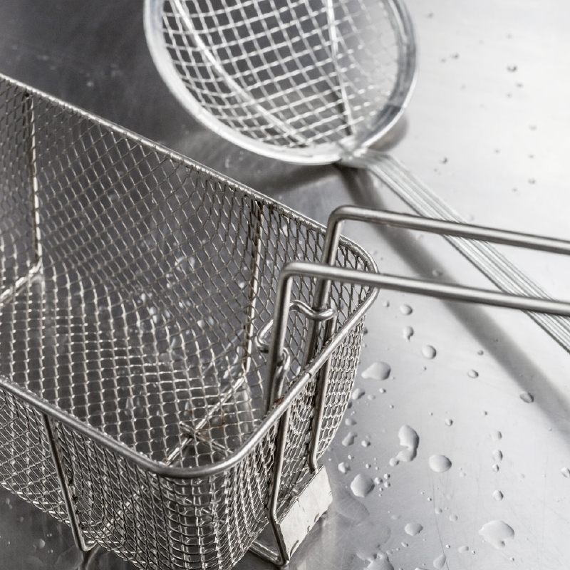 - Curatati friteuza, cosurile si separatoarele de ulei cu produse special create pentru acestea, urmand instructiunile din manualul producatorului (timp recomandat: 30 minute de curatare prin fierbere). Curatati cosurile metalice simultan prin imersarea lor in solutie – astfel vor fi inlaturate reziduurile depuse pe suprafata cosurilor. Opriti aparatul si inlaturati toate resturile depuse cu ajutorul unei lavete de nylon. Nu folositi lavete metalice abrazive sau perii care ar putea zgaria si lasa aschii in interiorul friteuzei. Toate urmele de material polimer trebuie inlaturate.